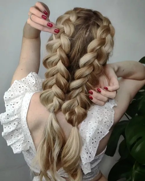 10. Double Dutch Braids: Divide your hair into two sections, create two Dutch braids on each side of your head and secure with hair ties. To learn how to do these hairstyles, search for tutorials online or ask your hairstylist for help.