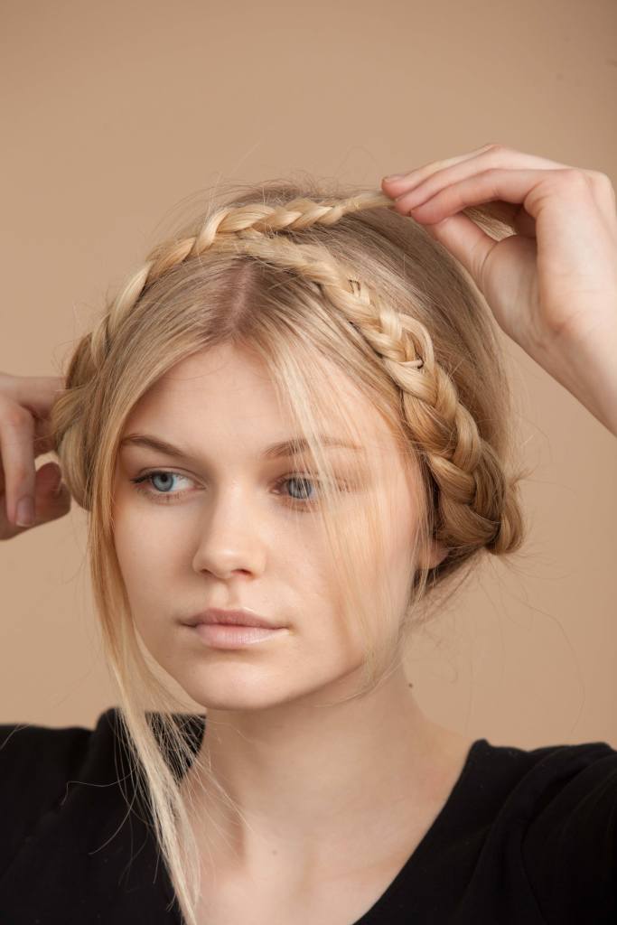 4. Braided Crown: Part your hair in the middle and braid each side, then wrap them around your head and secure with bobby pins.